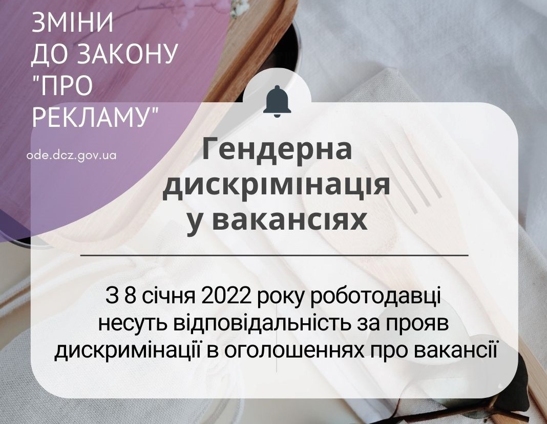 З 8 січня 2022 року в Україні набрав чинності Закон України «Про внесення змін до Закону України «Про рекламу» щодо протидії дискримінації за ознакою статі». Законом визначено, що таке «дискримінаційна реклама», «дискримінаційна реклама за ознакою статі» та посилено відповідальність за порушення законодавства про рекламу.