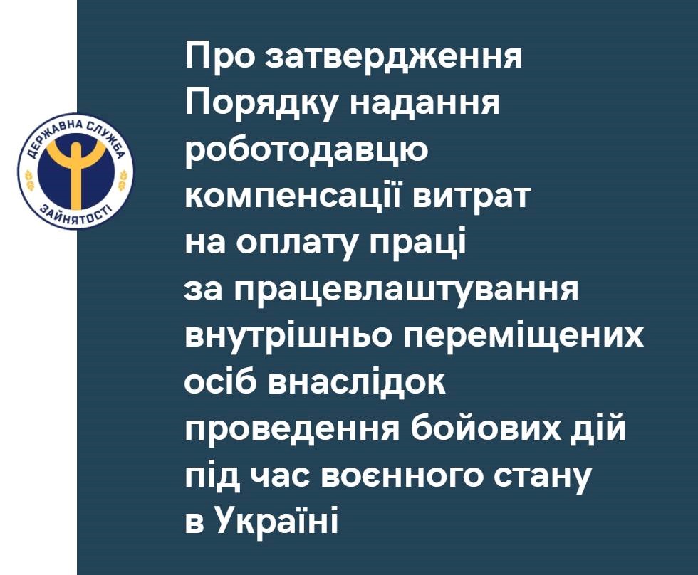 Кабінет Міністрів України затвердив Порядок надання роботодавцю компенсації витрат на оплату праці за працевлаштування внутрішньо переміщених осіб внаслідок проведення бойових дій під час воєнного стану в Україні.