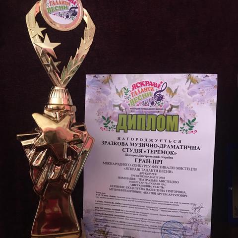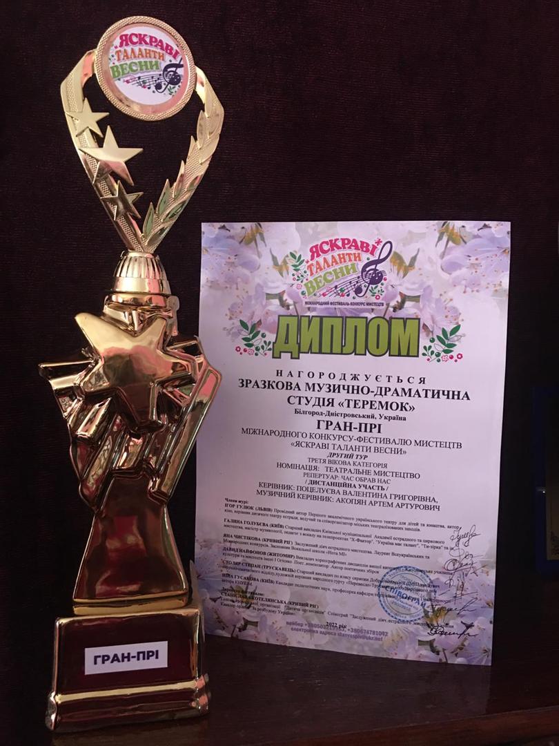 Мистецько-патріотичний проєкт «Час обрав нас» зразкової музично-драматичної студії «Теремок» міського Центру дитячої творчості (художній керівник Валентина Поцелуєва, музичний керівник Артем Акопян) відзначено Гран-прі міжнародного фестивалю-конкурсу мистецтв «Яскраві таланти весни 2022».