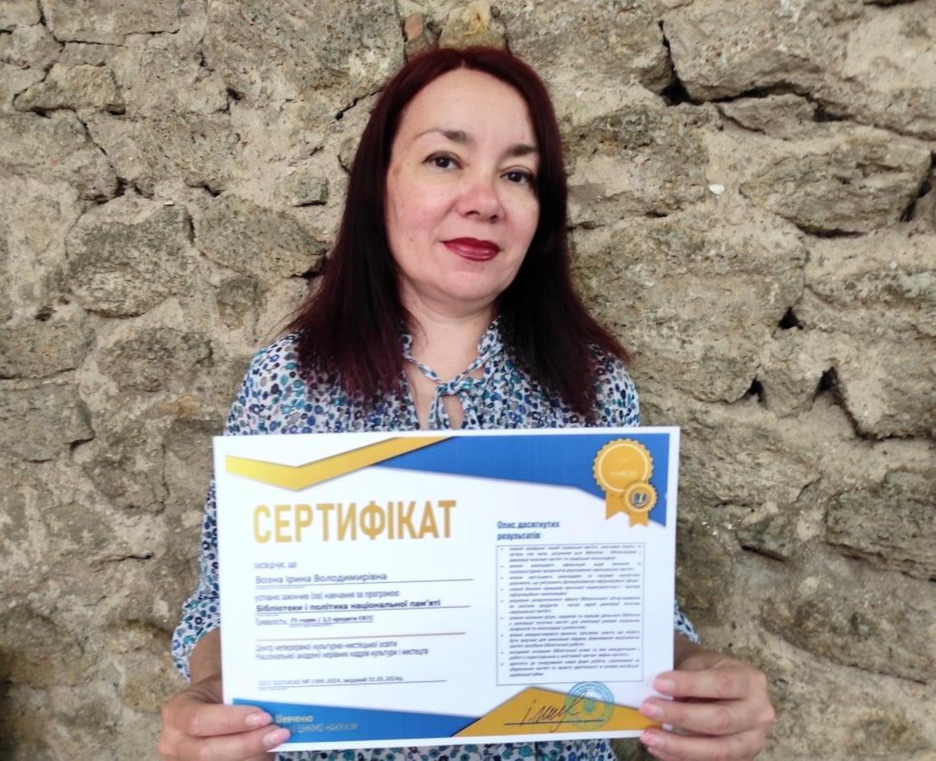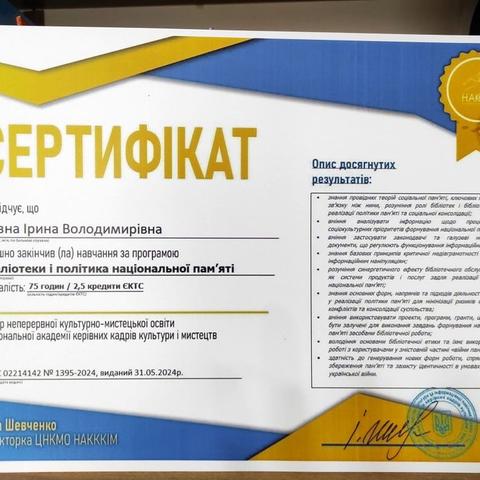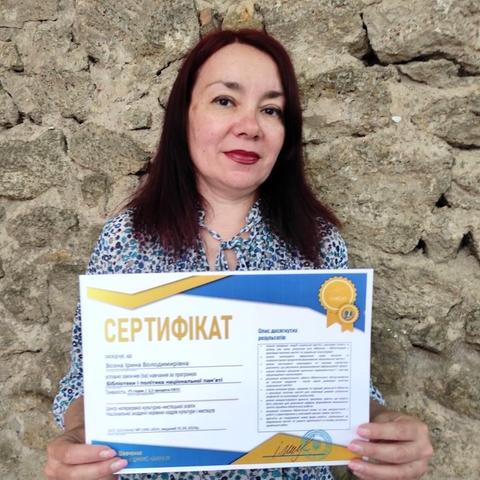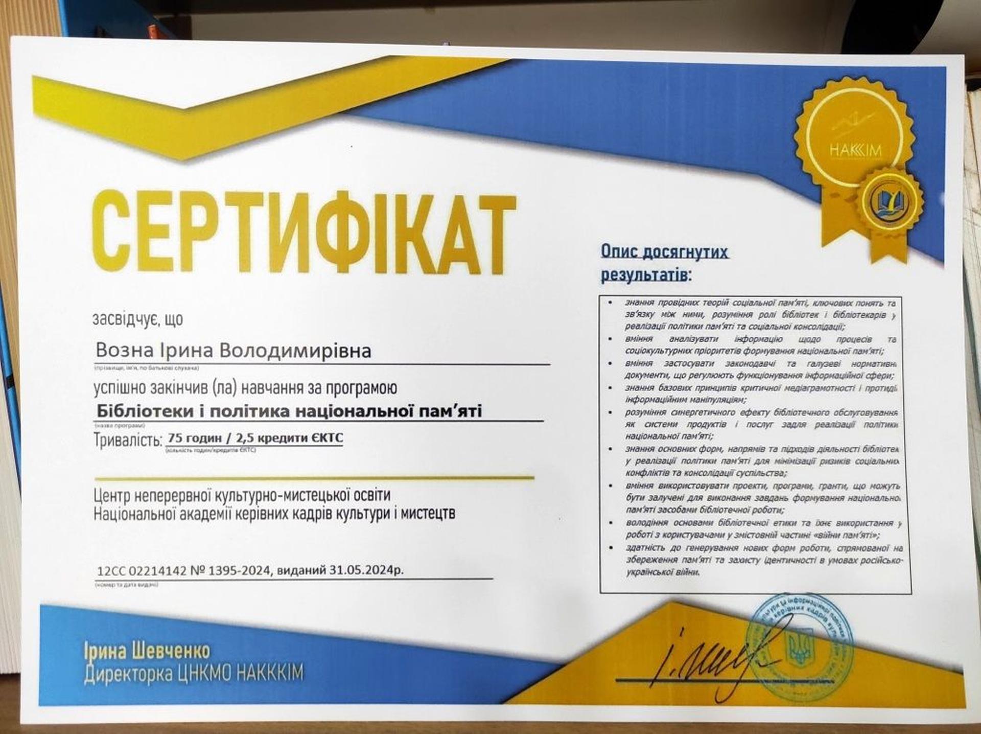 В процесі навчання розглядались цікаві теми: «Соціальна пам’ять та ідентичність», «Бібліотека як інституція пам’яті: завдання і напрями діяльності», «Простір пам’яті: дизайн і функціонування», «Бібліотека і війни пам’яті», «Пам’ять про російсько-українську війну. Спільне запам’ятовування» тощо. По завершенню навчання Ірина Возна отримала сертифікат. Тепер новими знаннями поділиться з бібліотекарями.