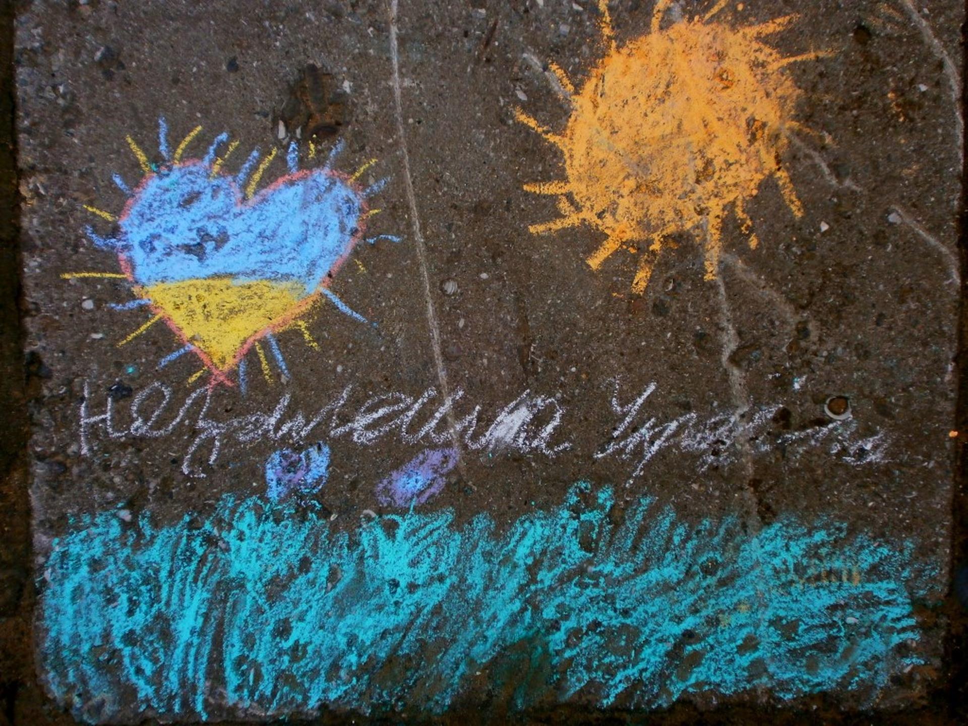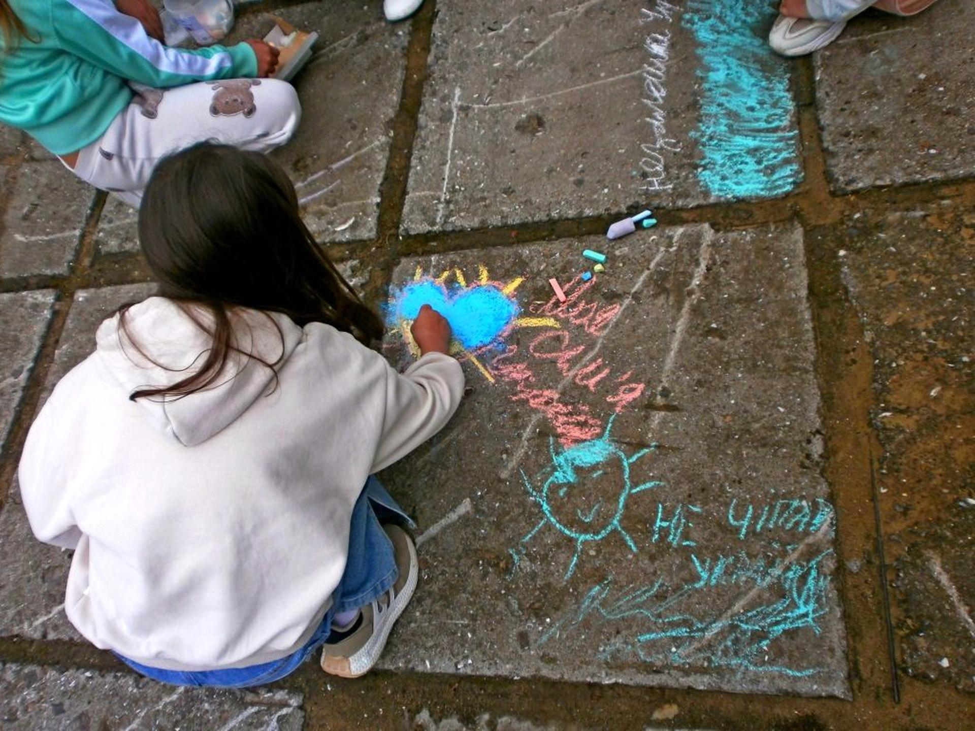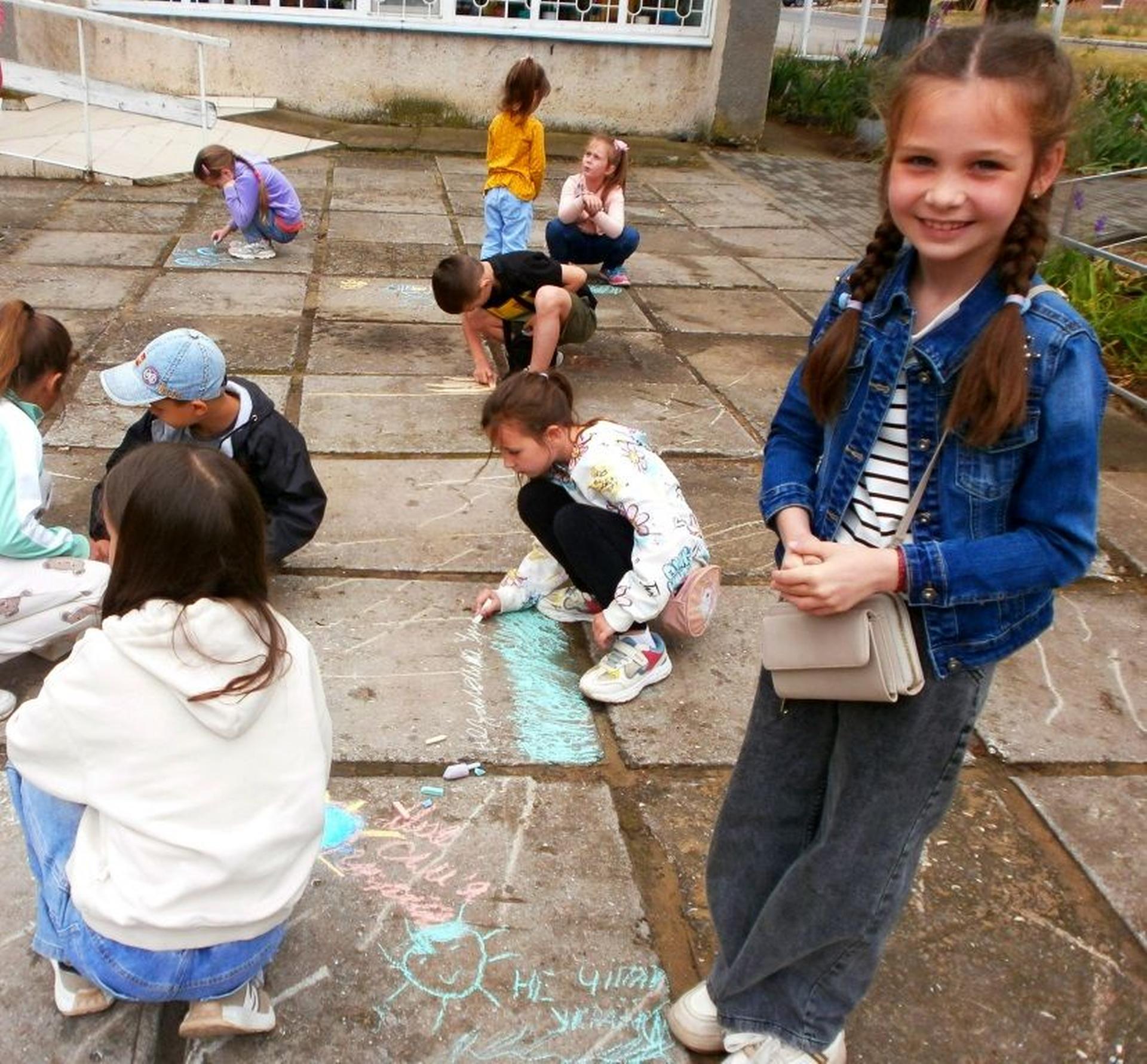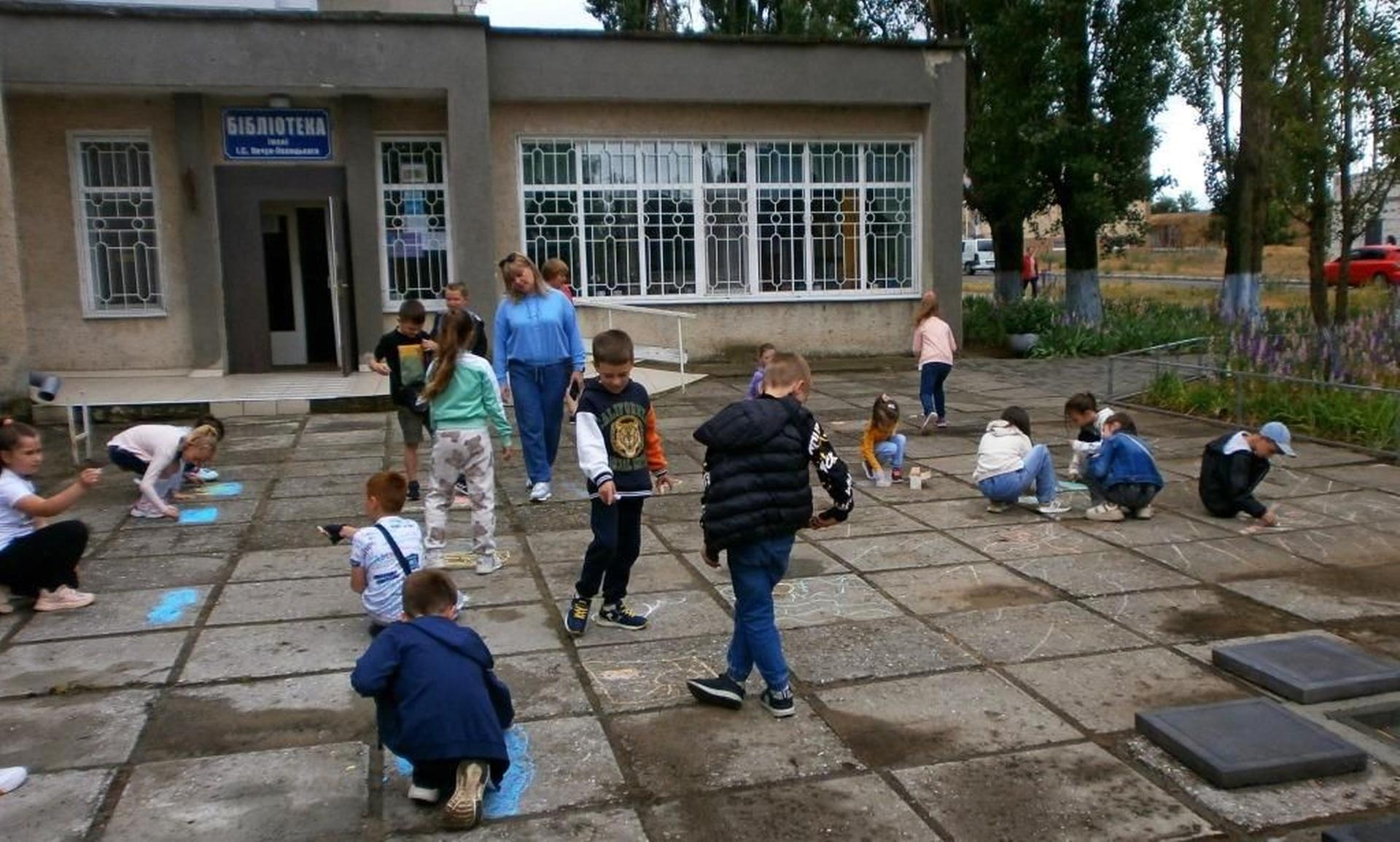 Гості бібліотеки проявили свої творчі здібності ще й на подвір’ї бібліотеки, розмальовуючи крейдою. Тематику діти обрали патріотичну, колір малюнків переважно жовтий та блакитний. Бібліотекарі, в свою чергу, запросили дітлахів приходити на різноманітні бібліотечні заходи з рідними та друзями.