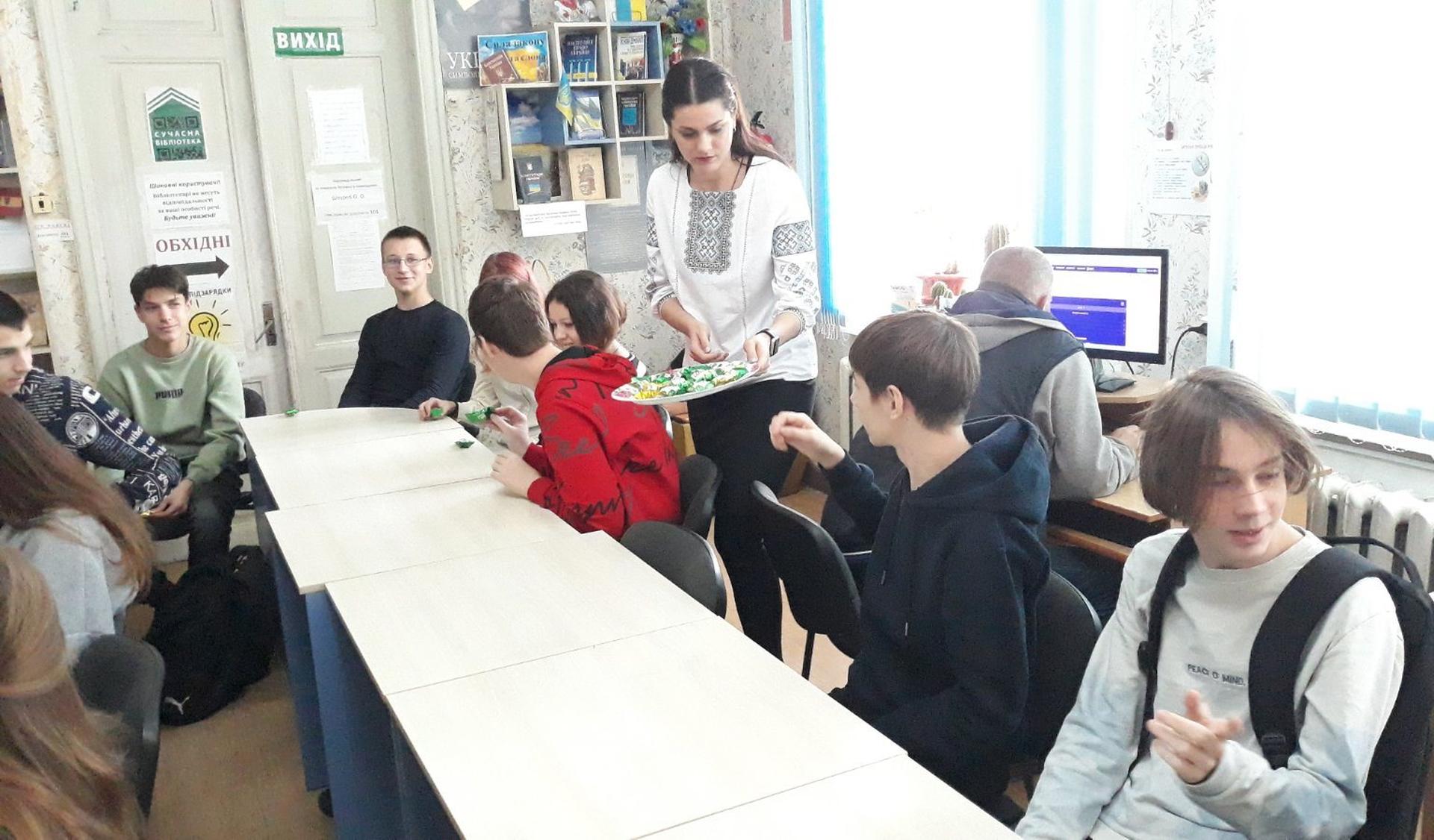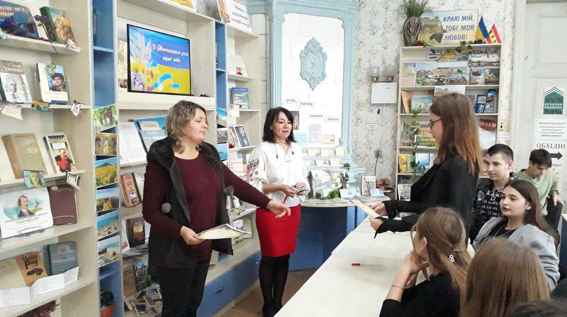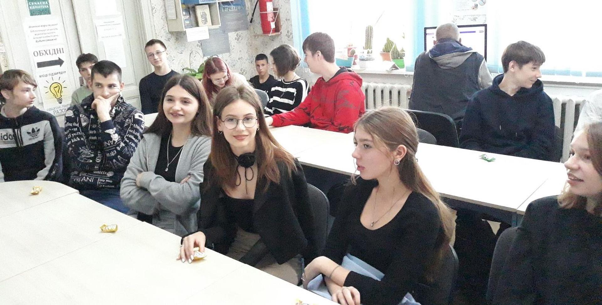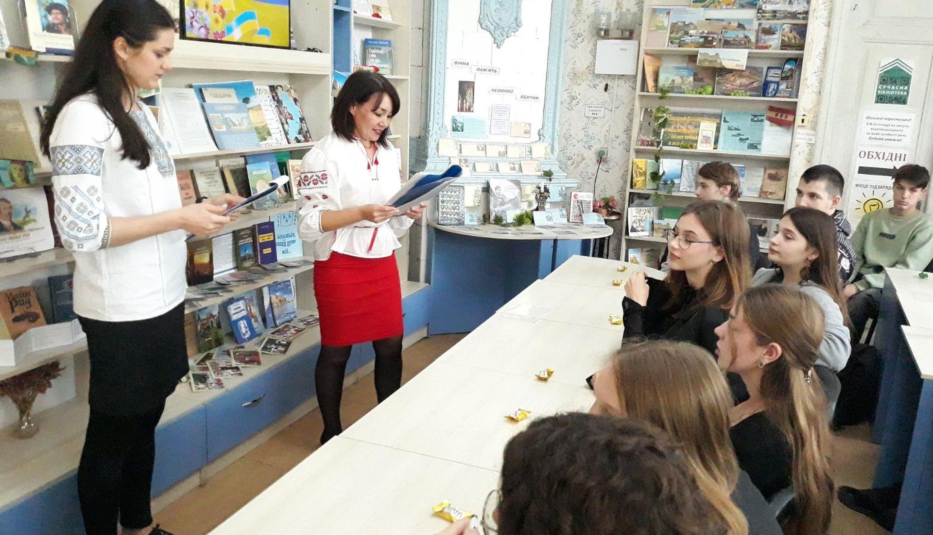 Сучасна літературна українська мова з’явилася у XVIII столітті. Першим твором, написаним з її використанням, вважається «Енеїда» І.П. Котляревського. Остаточно закріпив розмовну українську мову в літературних творах поет Т.Г. Шевченко. Українська писемність та мова ще проходять шлях становлення й розвитку. Вона розвивається завдяки багатьом сподвижникам і патріотам різних поколінь. Про це розповідали в Публічній бібліотеці учням ліцею «Лідер». Також юнаки та дівчата завзято поринули в інтелектуальну гру-конкурс «До перлин рідного слова душею прилиньмо!». Вони розділилися на дві команди та жваво змагалися у різноманітних мовознавчих конкурсах. Всі отримали подарунки, а переможці – подяки. Потім Вікторія Осадчук - бібліотекарка, молода поетеса, прочитала свої вірші.