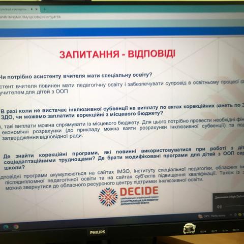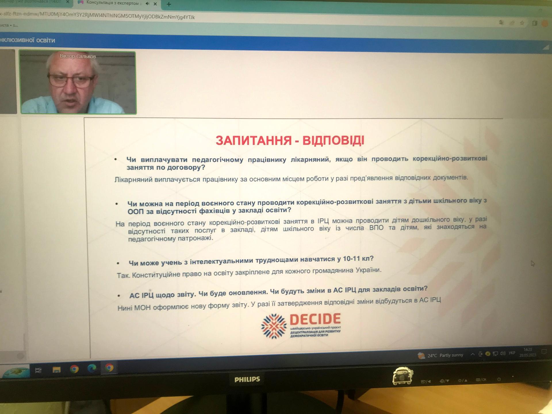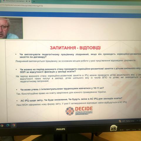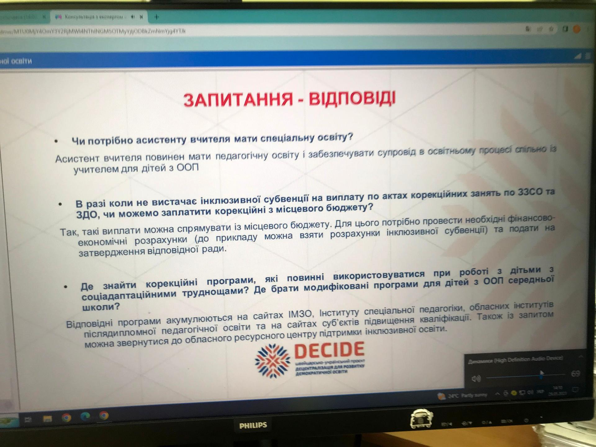 У рамках швейцарсько-українського проєкту DECIDE – «Децентралізація для розвитку демократичної освіти», 29 травня фахівці Управління освіти Білгород-Дністровської міської ради Світлана Селезньова та Валентина Корінь взяли участь у онлайн вебінарі на тему: «Консультація з експертом щодо інклюзивної освіти», з метою розвитку ефективної системи управління освітою з питань надання освітніх послуг дітям з особливими освітніми потребами.
