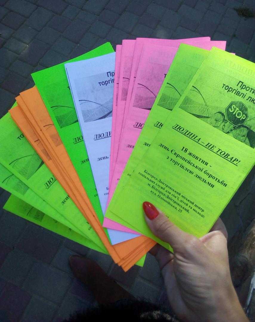 Саме тому 17 жовтня, напередодні відзначення Європейського дня боротьби з торгівлею людьми, спеціалісти Білгород-Дністровського міського центру соціальних служб для сім’ї, дітей та молоді, разом зі студентами педагогічного училища, учасниками “Школи волонтерів”, взяли участь у акції “Людина - це не товар!”. Метою якої являється підвищення рівня обізнаності молоді нашого міста з видами сучасного рабства та нагадування про актуальність проблеми торгівлі людьми.