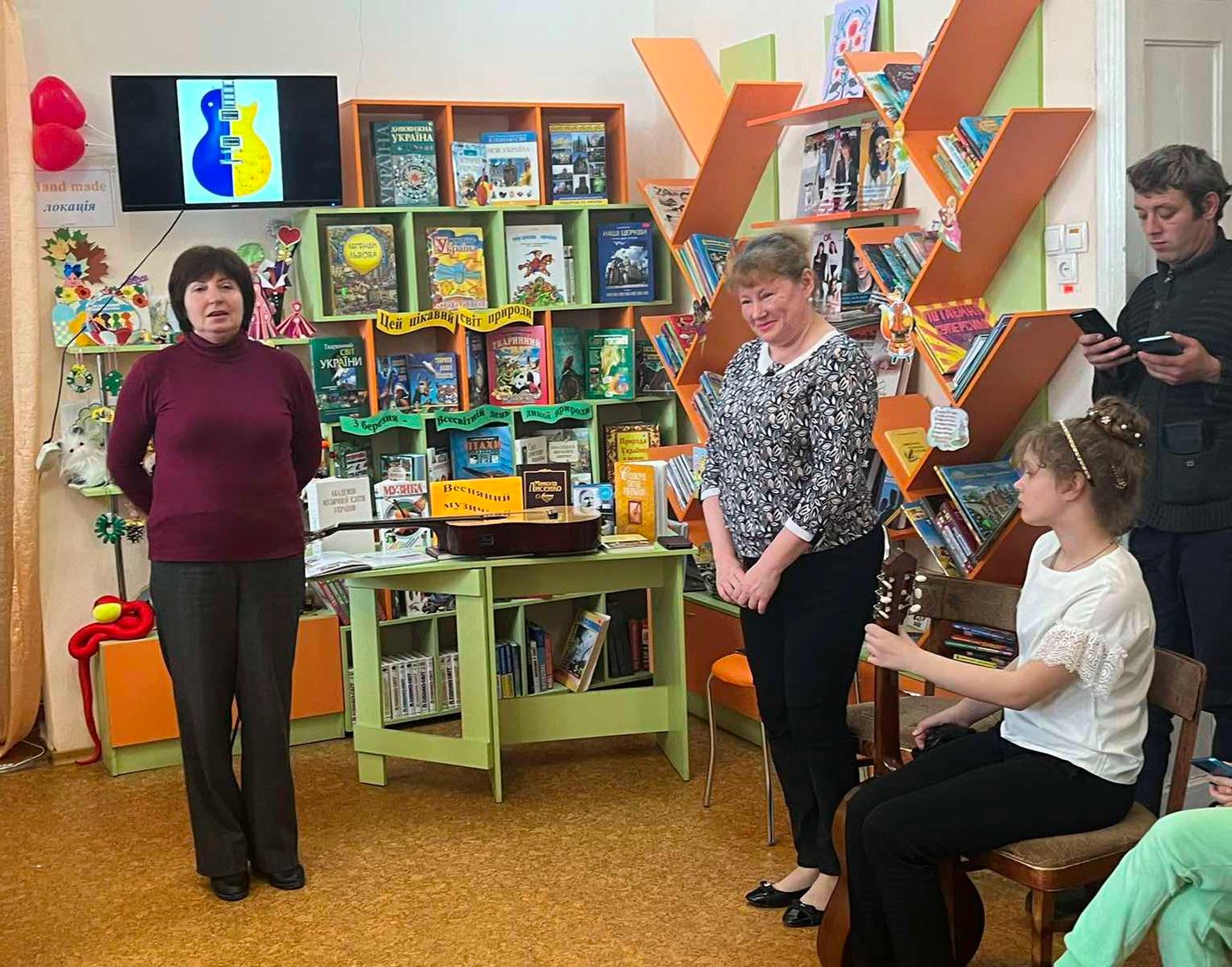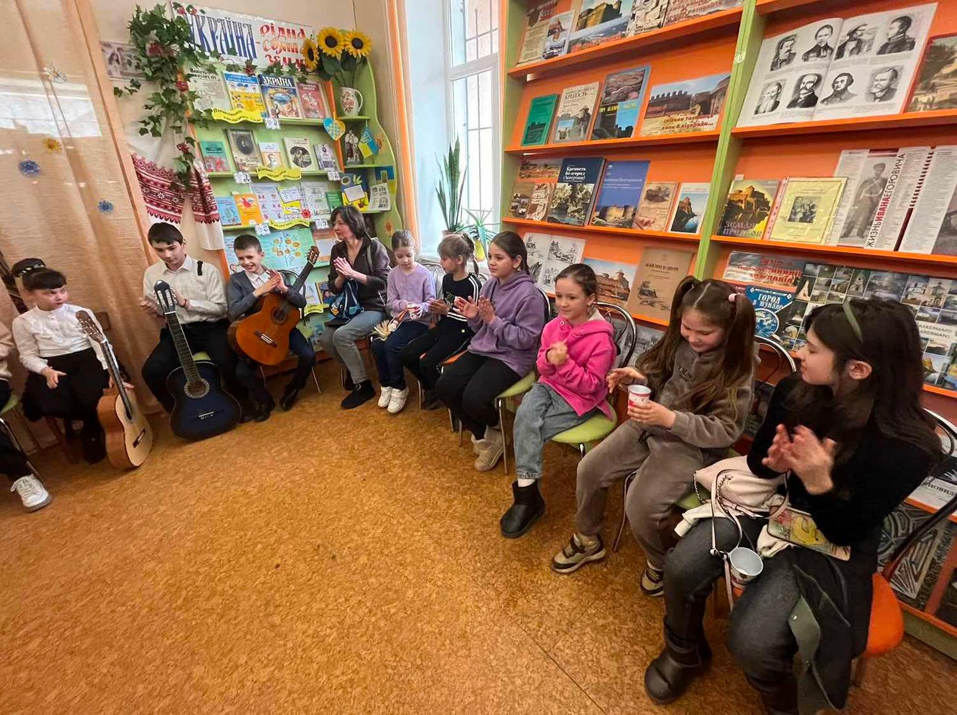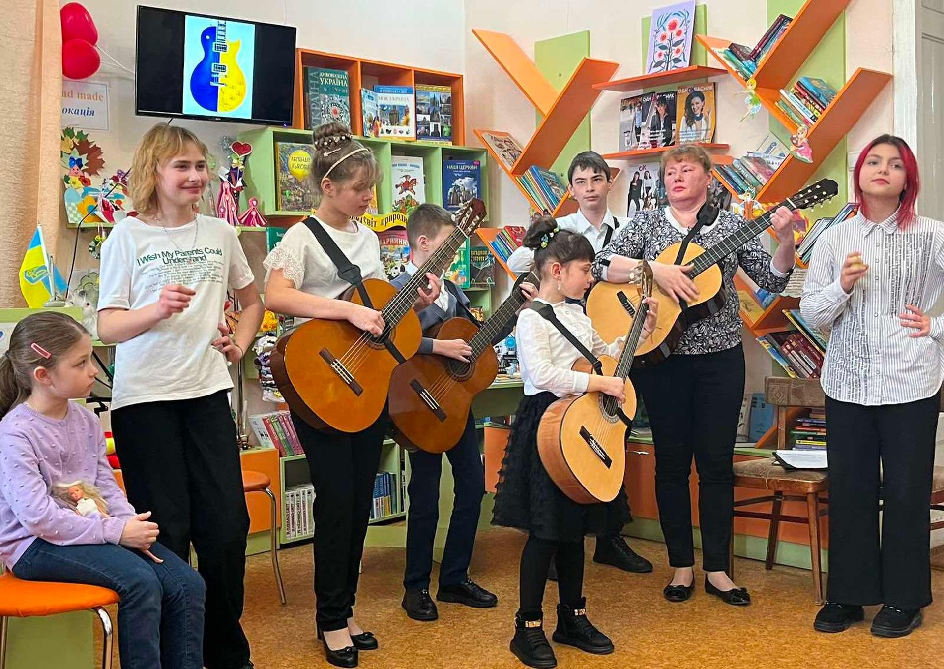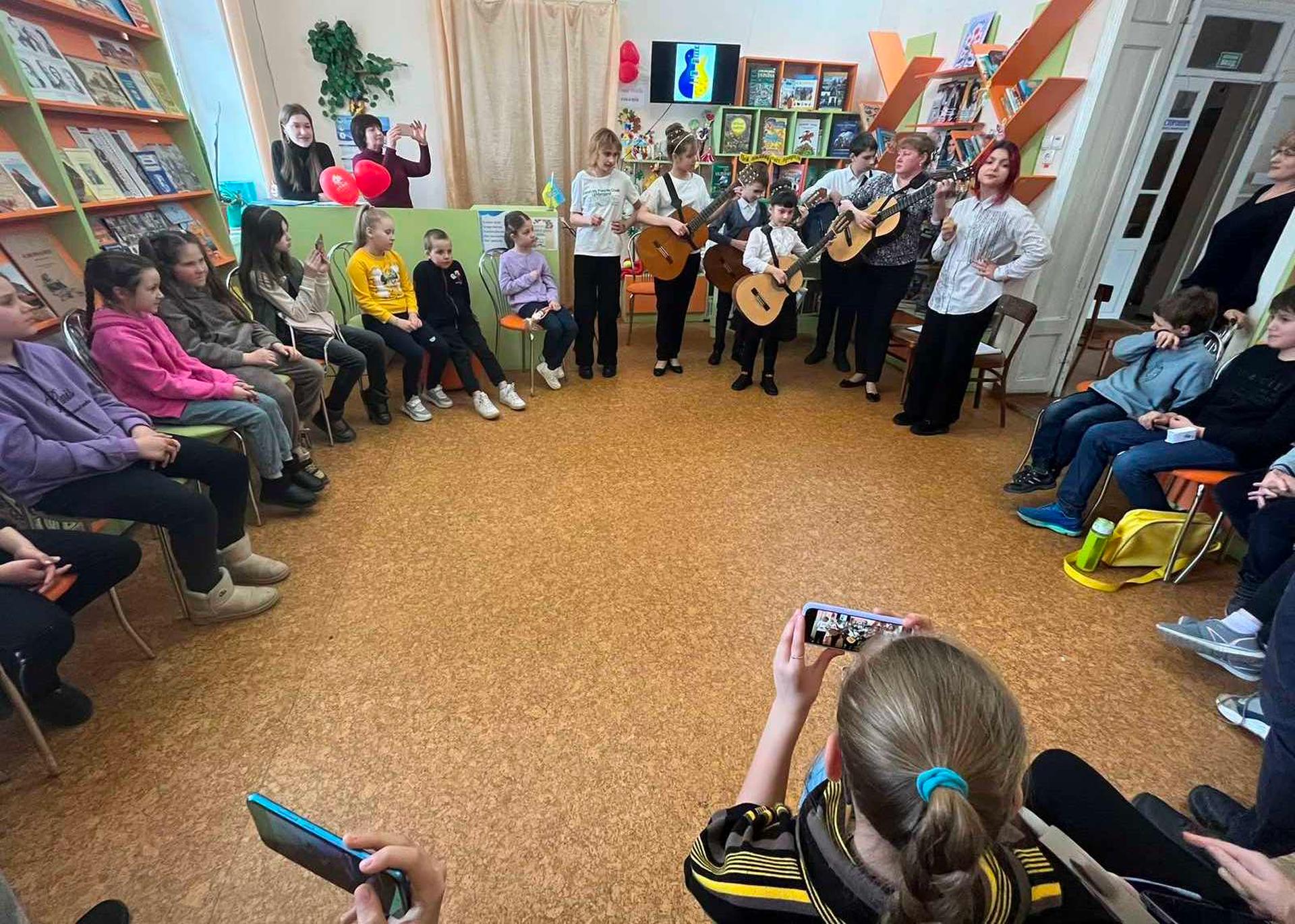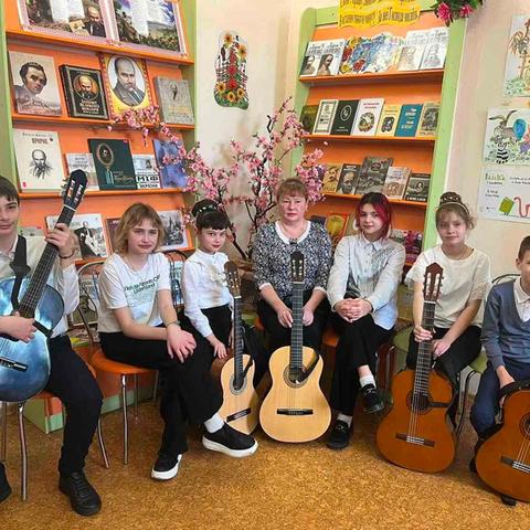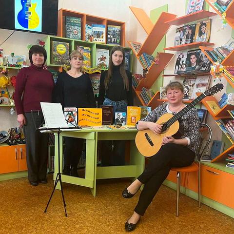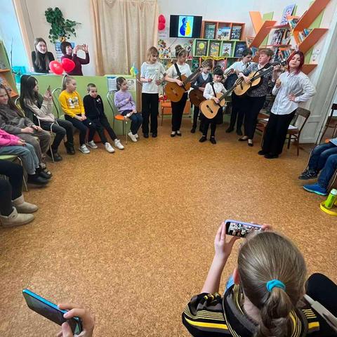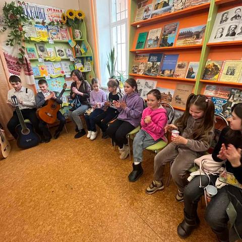 Канікули в бібліотеці – це завжди цікаві зустрічі з книжками, бібліотекарями, друзями, запрошеними гостями. Саме у відділ обслуговування дітей та юнацтва Публічної бібліотеки запросили зразковий ансамбль гітаристів «Торнадо» - викладач та музичний керівник Світлана Шутова (КЗ «Шабівська музична школа», директор Лідія Молорова). Місцеві дітлахи та сім’ї ВПО в нашому місті є постійними відвідувачами бібліотечних заходів. Фан-паті під гітару «Весняний музичний калейдоскоп» об’єднав увагу присутніх різноманітними розповідями та вікторинами.