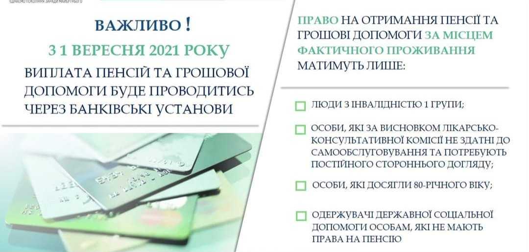 Інші категорії пенсіонерів, які на сьогодні отримують виплати у відділеннях АТ “Укрпошта” або з доставкою додому листоношами, до 1 вересня 2021 повинні обрати один з уповноважених банків для здійснення подальшої виплати пенсії з переліку, з яким можна ознайомитись за посиланням:https://www.pfu.gov.ua/1906048-perelik-bankiv.../.