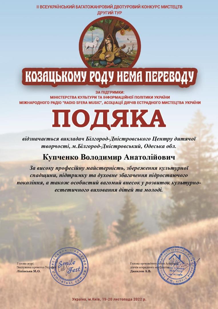 Вітаємо вихованців та їх керівника Купченка Володимира Анатолійовича з перемогою. Бажаємо натхнення для творчих успіхів у майбутніх конкурсах!