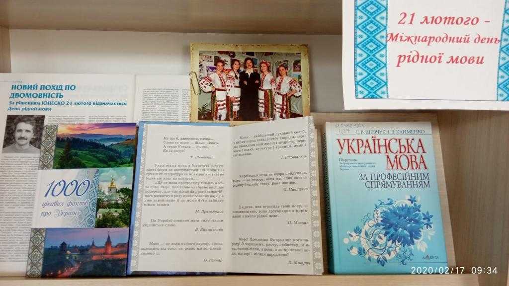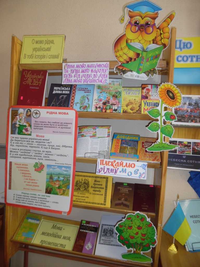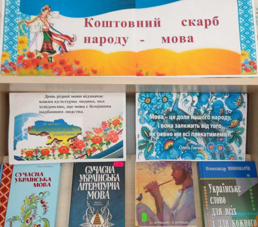 Українська мова входить до групи найбільш розвинених і досконалих мов. Що ми знаємо про українську мову? Вона гарна, мелодійна. Перші літературні твори співочою, солов’їною були написані Т. Г. Шевченком («Кобзар» 1840 року), І.П. Котляревським («Енеїда» 1798 року). В бібліотеках міста до Міжнародного дня рідної мови, для користувачів різних вікових категорій створено низку книжкових експозицій: «Коштовний скарб народу - мова» – в центральній міській бібліотеці ім. М. Горького, «З сивої глибини віків бере початок рідна мова» – в бібліотеці ім. О. Пушкіна, «О мово рідна, Українська! В тобі історія і слава!» – в бібліотеці ім. М. Кропивницького. Кожен бажаючий, завітавши до бібліотек, має чудову можливість познайомитися з довідниками, підручниками з української мови та літератури, книжками українських поетів та письменників тощо.