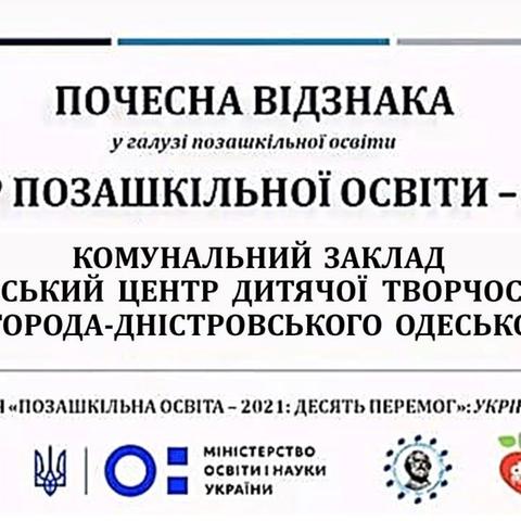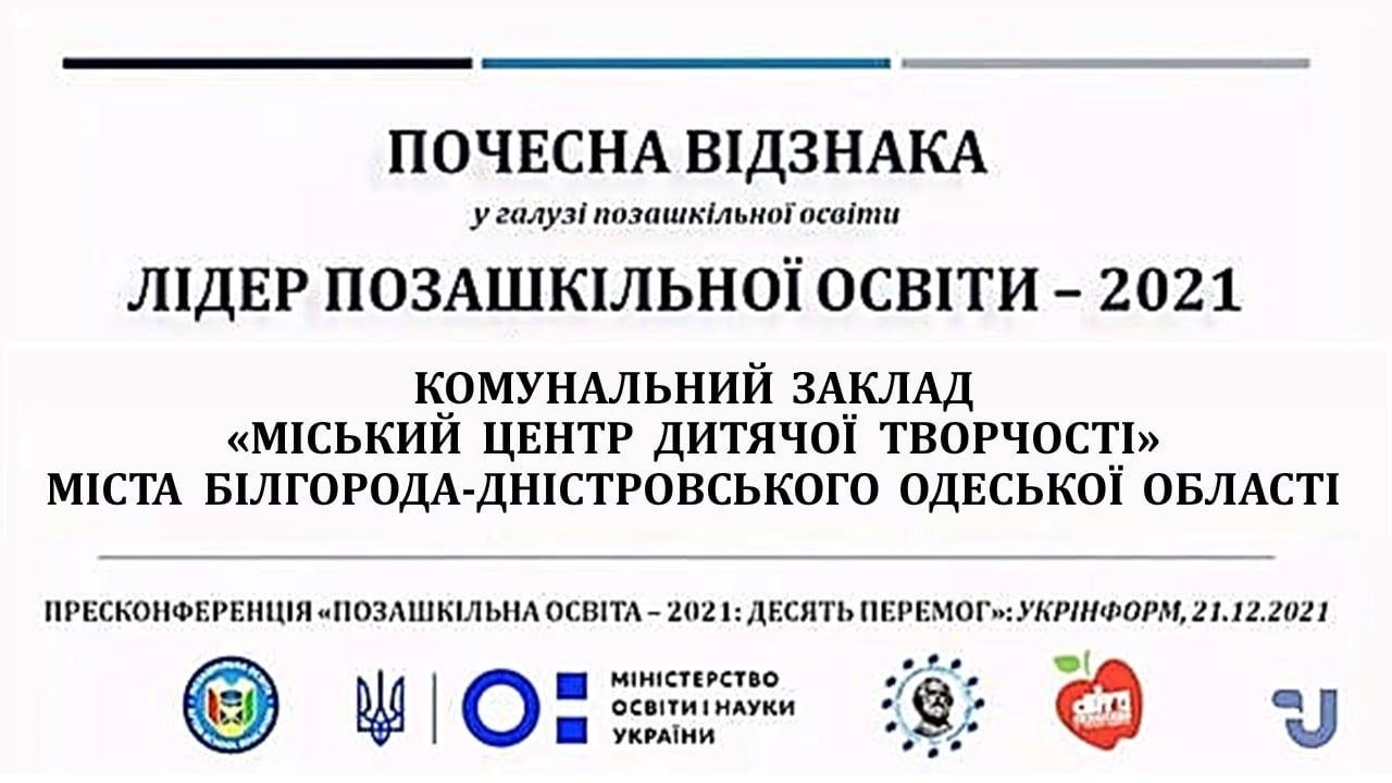 За вагомий вклад у розвиток позашкільної освіти Білгород-Дністровський міський Центр дитячої творчості нагороджено Почесною відзнакою «Лідер позашкільної освіти – 2021».