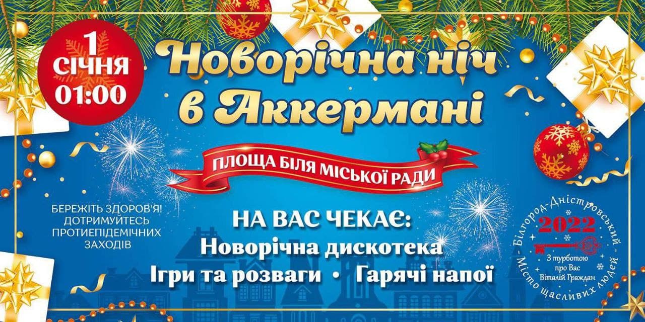 Зустрінемо Новий рік разом! Святкова вечірка «Новорічна ніч в Аккермані» розпочнеться об 01:00 год. 1 січня 2022 року на площі біля будівлі міської ради по вул. Михайлівській.
