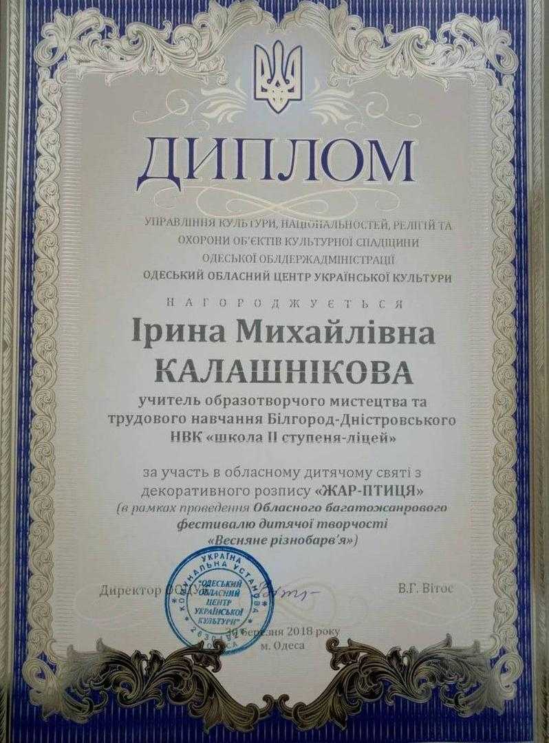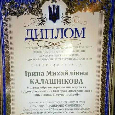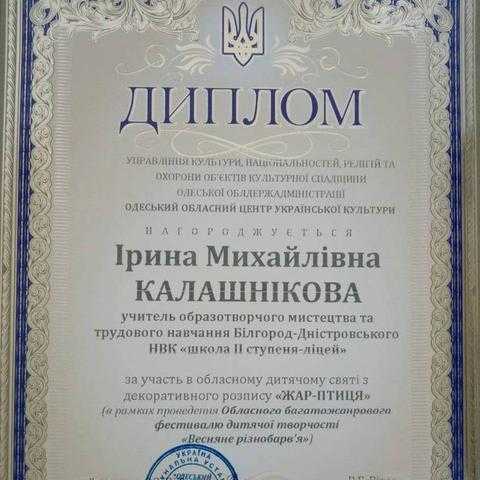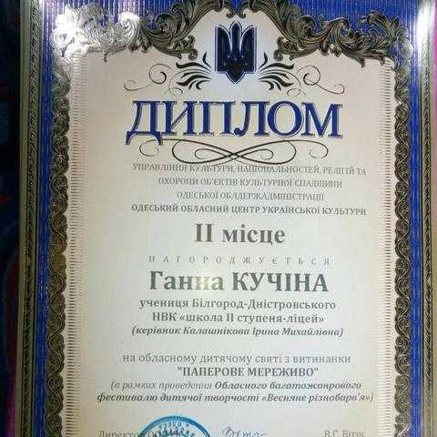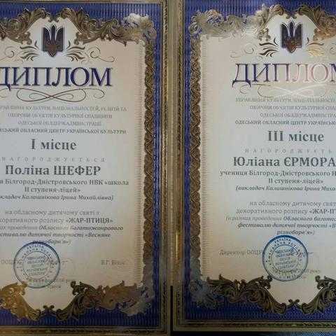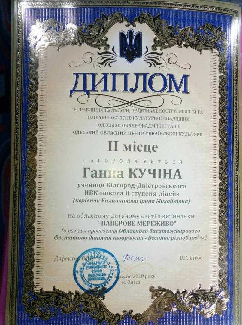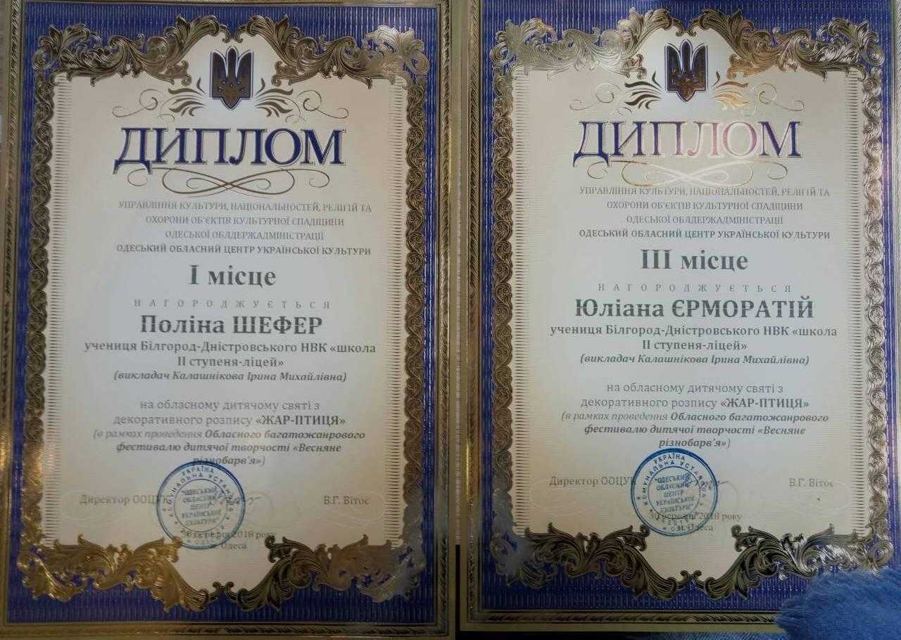 І, це вже стає хорошою традицією, у нас є переможці: Ганна Кучіна посіла ІІ місце на обласному дитячому святі з витинанки «Паперове мереживо», у Поліни Шефер – І місце, у Єрморатій Юліанни – ІІ місце, а у Гамурар Христини – грамота на обласному дитячому святі з декоративного розпису «Жар-птиця». Дипломами управління культури, національностей, релігій та охорони об’єктів культурної спадщини Одеської облдержадміністрації за участь в обласних дитячих святах з витинанки «Паперове мереживо» та з декоративного розпису «Жар-птиця» нагороджена вчитель образотворчого мистецтва НВК «ЗОШ-ліцей» Калашнікова І.М.