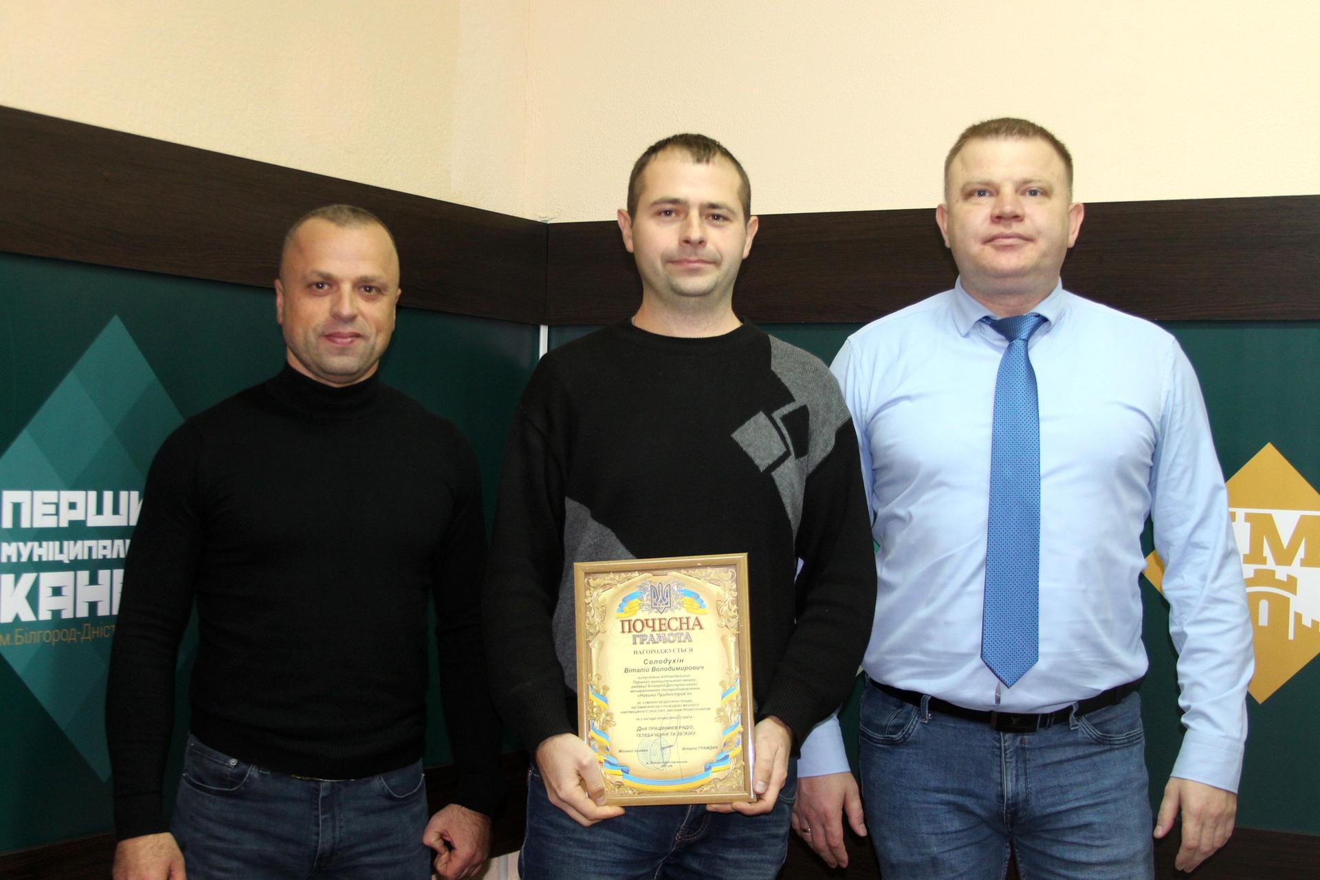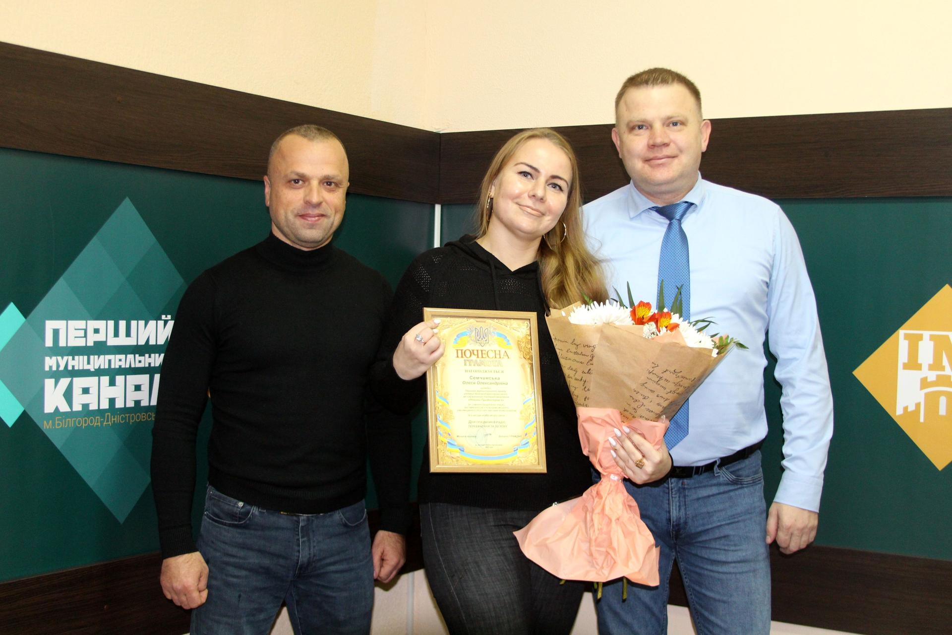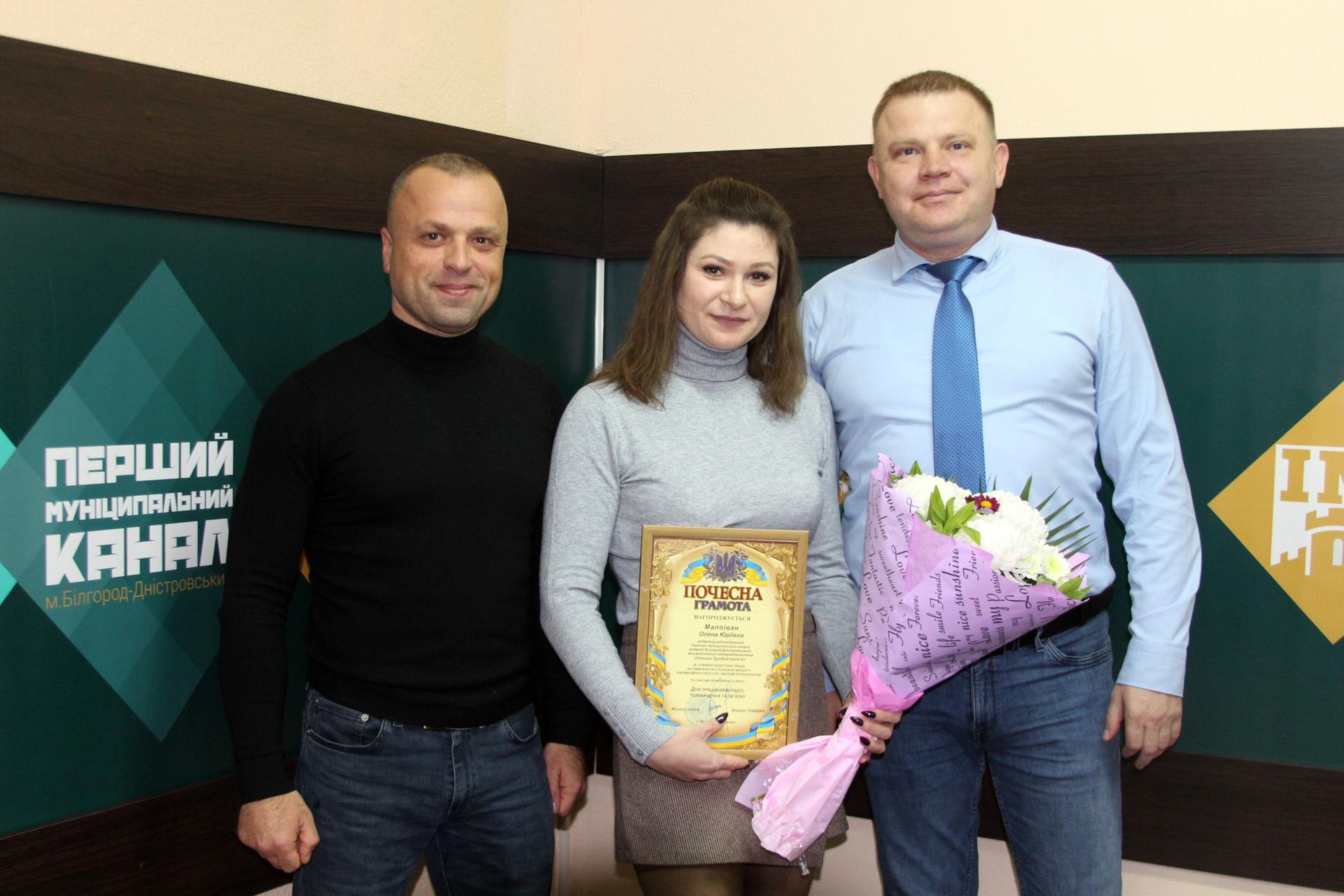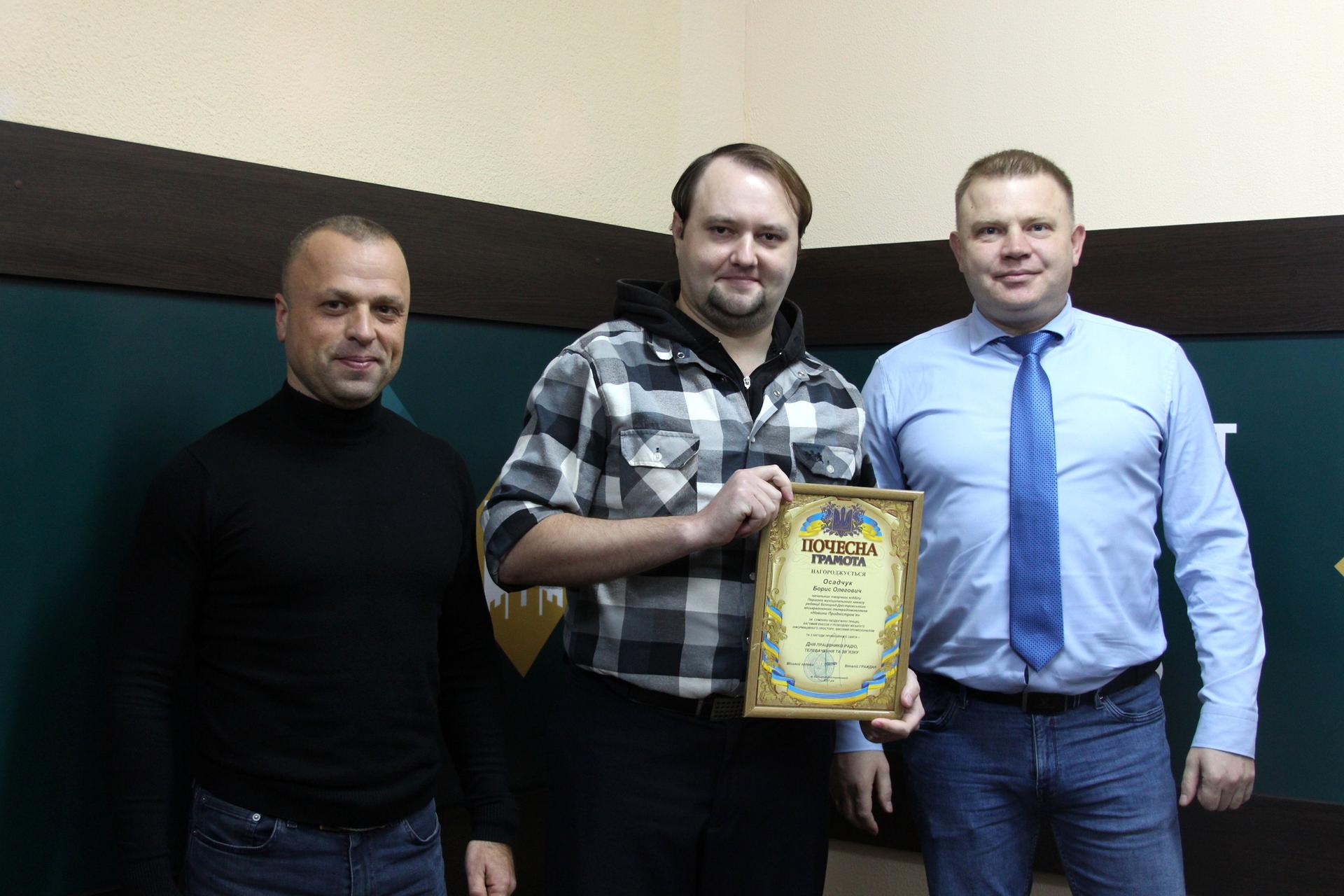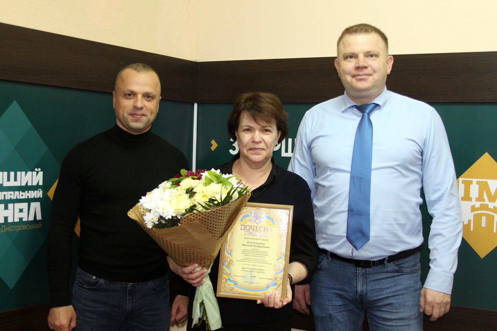 За сумлінну бездоганну працю, вагомий особистий внесок у розбудову міського інформаційного простору, високий професіоналізм та з нагоди професійного свята Почесною грамотою нагородили директора ТРК «Новини Подністров’я» Наталію Скопінцеву, відповідального редактора Олену Малоіван, відповідальних випускових Анатолія Лук'янчука і Віталія Солодухіна, оглядача Олесю Семчинську, начальника творчого відділу Бориса Осадчука та бухгалтера Олену Прусову.