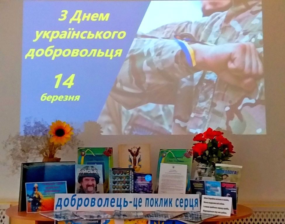 День українського добровольця в нашій Державі відзначається 14 березня. В цей день 2014 року перші 500 бійців-добровольців Самооборони Майдану прибули на тренувальну базу в Нових Петрівцях для формування першого добровольчого батальйону. З початком російської агресії проти України тисячі відданих українських синів і дочок йшли добровольцями на фронт. Всі вони стали солдатами, які боронили рідну землю від ворога. В ряди української армії добровольцями пішли і зовсім юні хлопці, і зрілі чоловіки. Хтось в мирному житті був лікарем, дехто менеджером, кухарем, програмістом тощо. Тисячі звичайних українських громадян, залишивши власні справи, пішли на Майдан, висловлюючи протест проти антидержавної політики тодішнього вищого керівництва країни, а потім зі зброєю в руках першими протистояли озброєній до зубів російській армії.