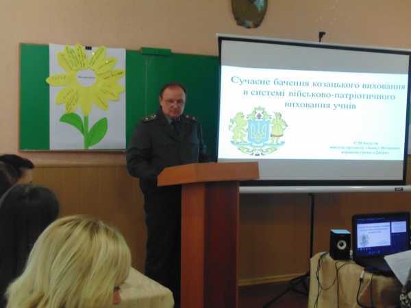 Про сучасне бачення козацького виховання в системі військово-патріотичного виховання учнів висловив свої думки та продемонстрував цікаві форми роботи, вчитель предмету «Захист Вітчизни», керівник шкільного гуртка «Джура» Анур’єв С.М.