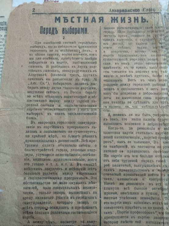 Особливу зацікавленість становлять події української революції в нашому регіоні. В міському краєзнавчому музеї зберігаються цінні матеріали, які свідчать про історію краю цього періоду, зокрема газета «Аккерманське слово». Нечисленні екземпляри 1917, 1918 років демонструють, що наше провінційне місто не залишалося осторонь революційних подій. До прикладу – фрагмент з статті «перед Виборами» газети «Аккерманське слово» за 8 серпня 1917 р., який демонструє, що мешканці міста та регіону в цілому стають перед нелегким вибором: