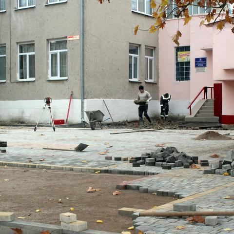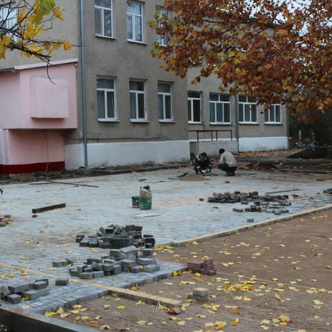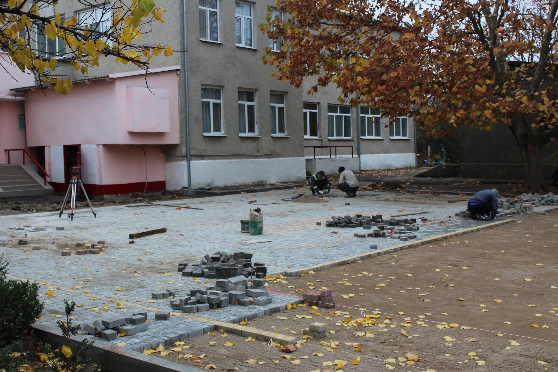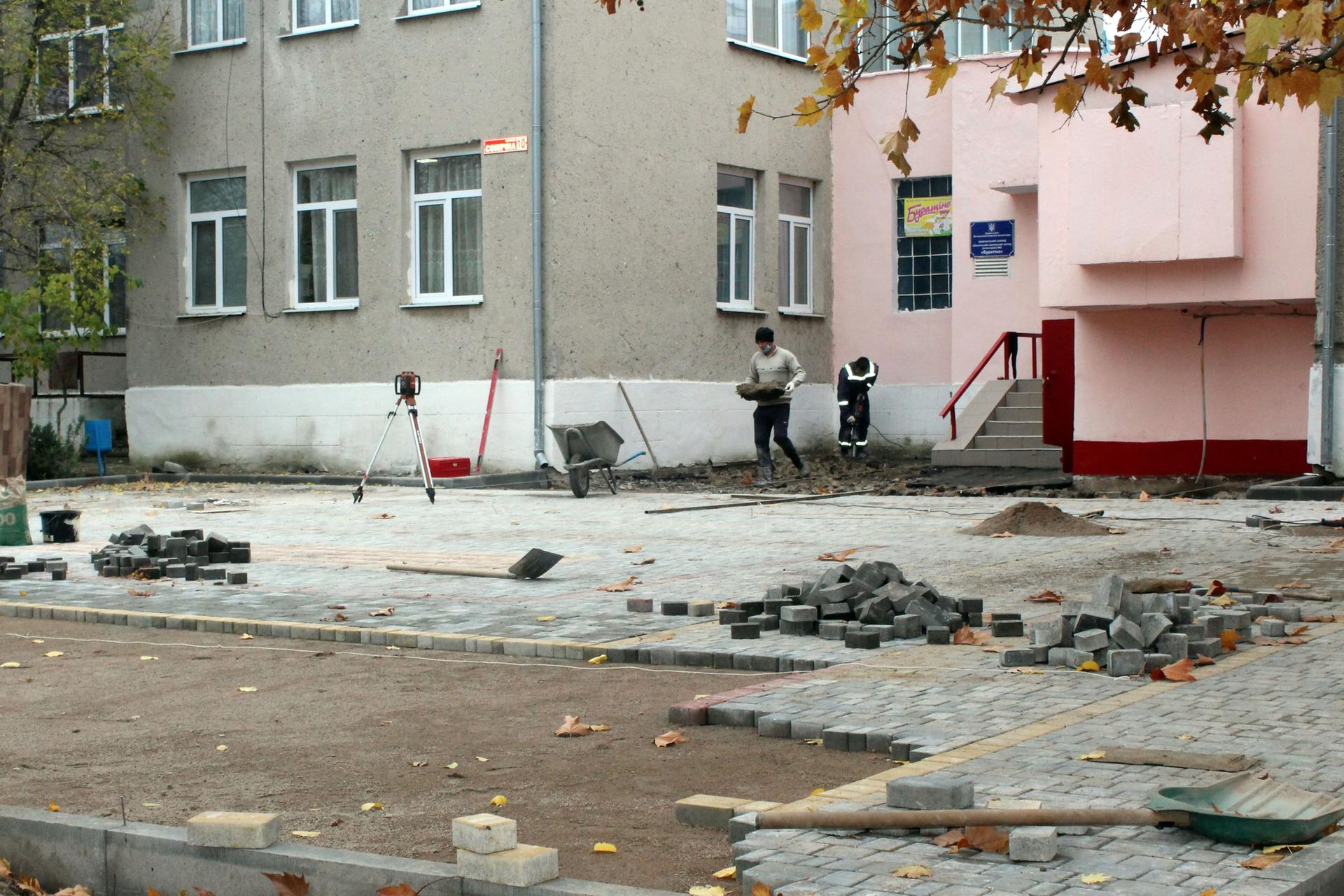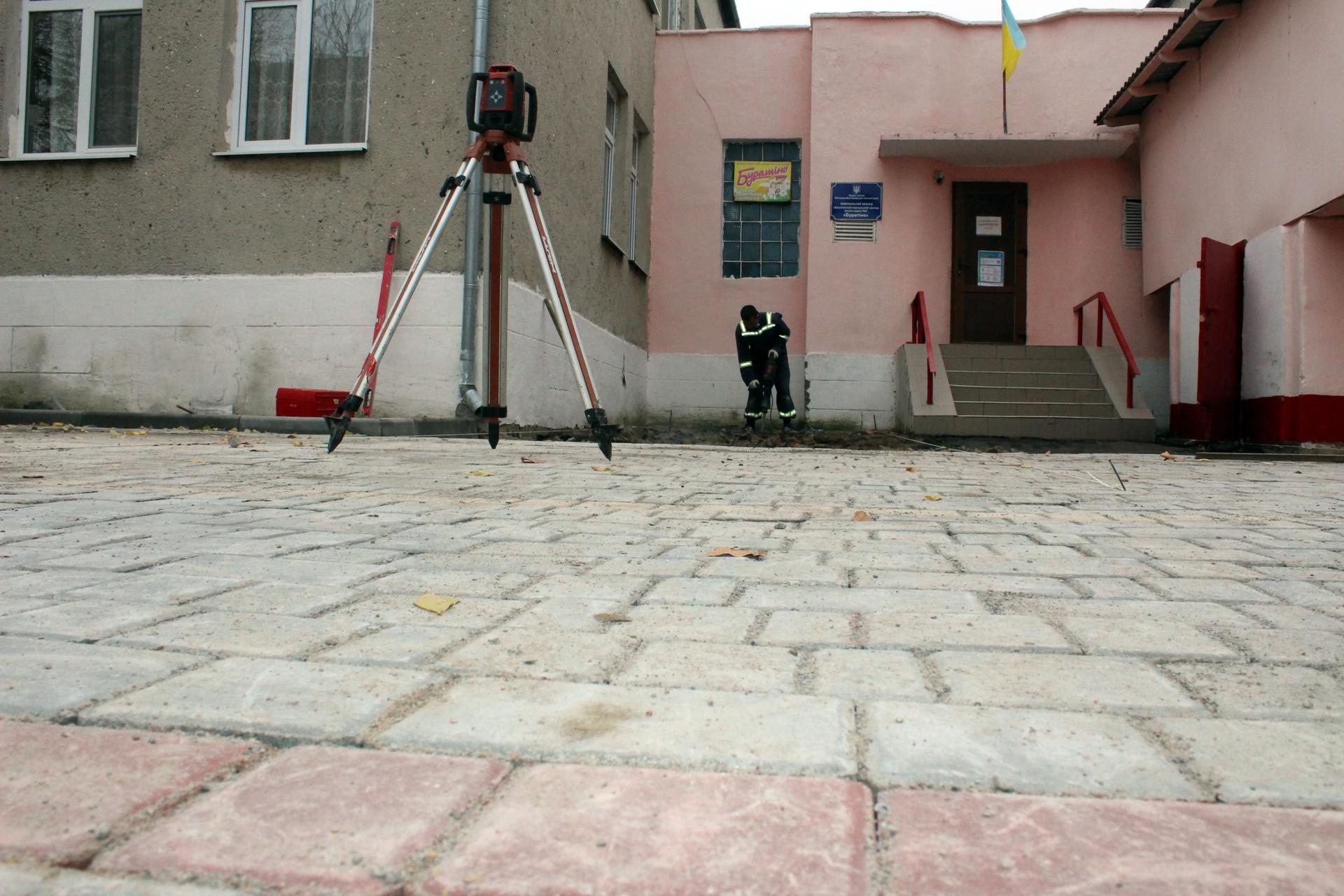 На подвір’ї дитячого садочку №2 «Буратіно», за рахунок коштів міського бюджету, облаштовується новий майданчик – укладається тротуарна плитка на місці, де було демонтовано старе асфальтове покриття.