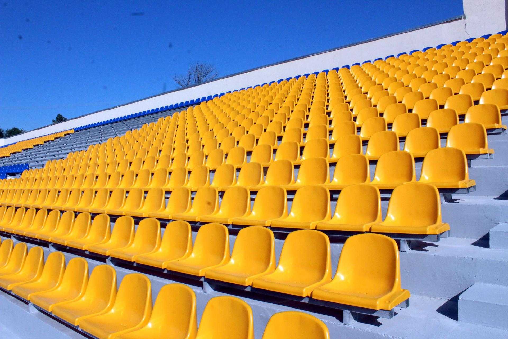 На головній трибуні центрального міського стадіону тривають роботи з монтажу сидінь для глядачів спортивних матчів. На даний час змонтовано вже більше половини посадочних місць.