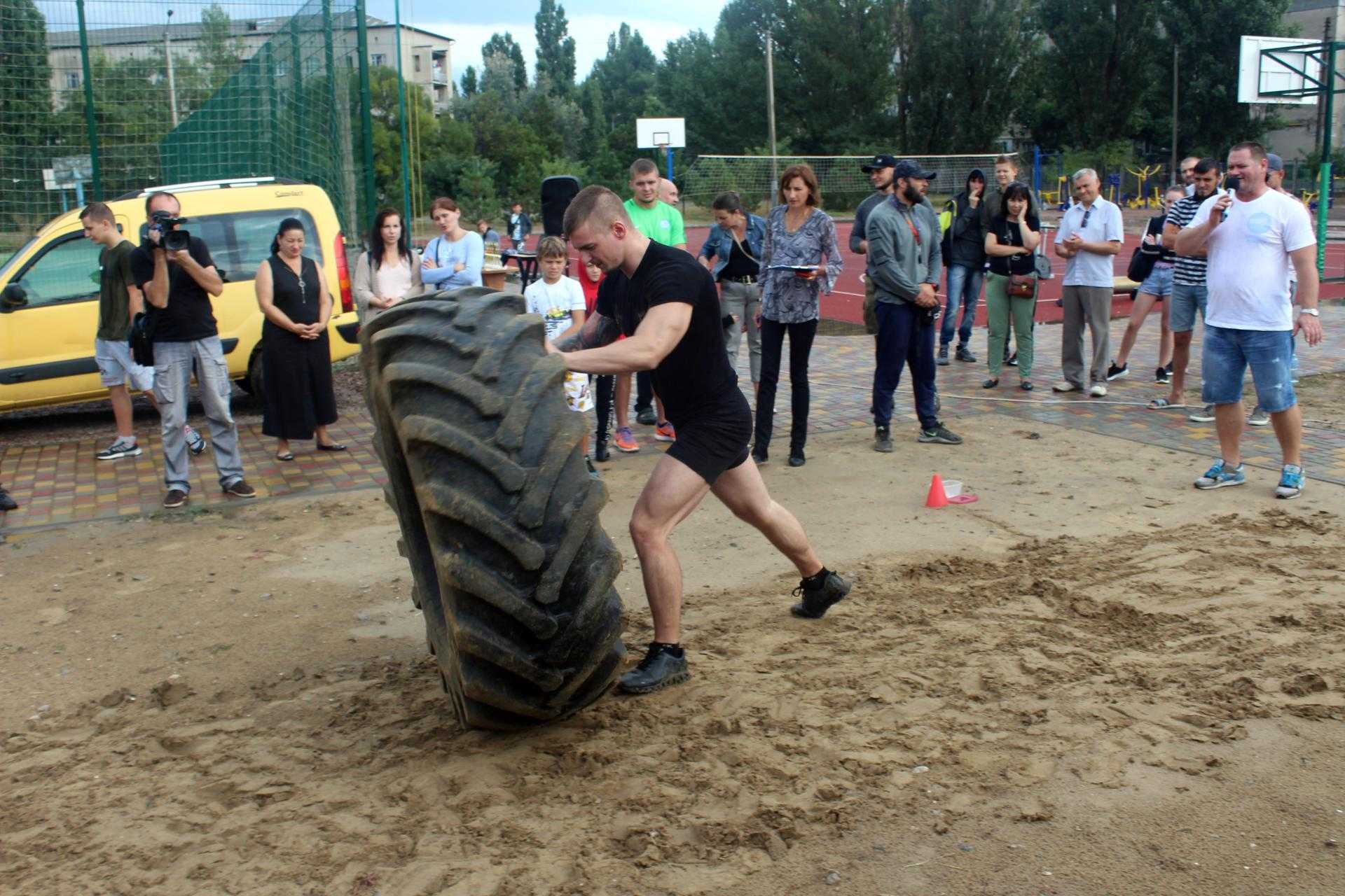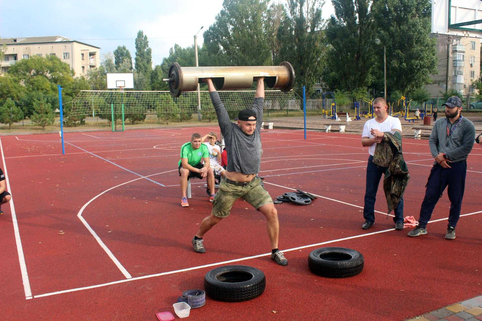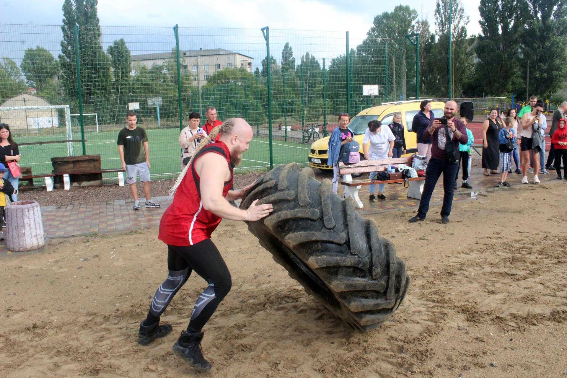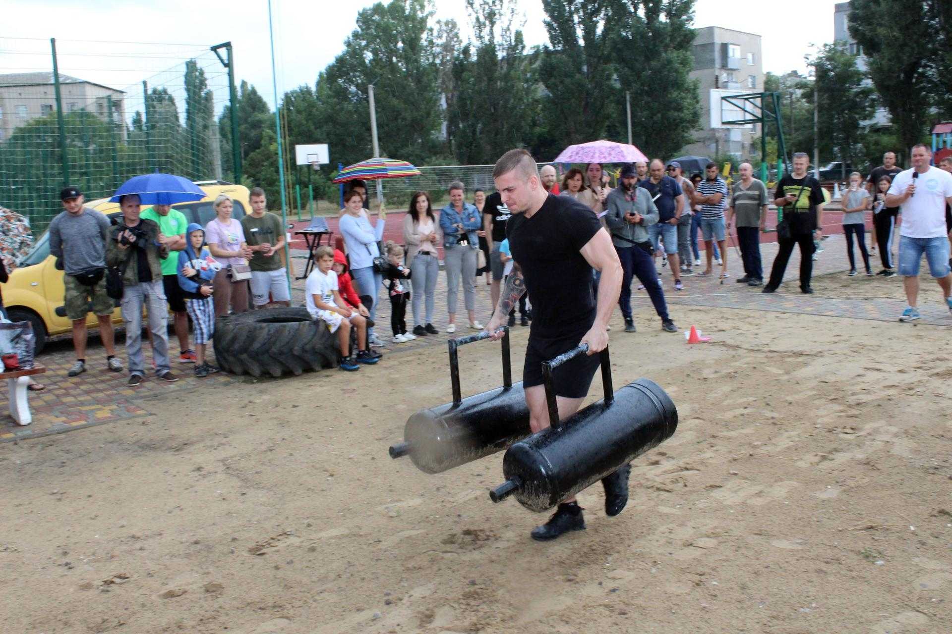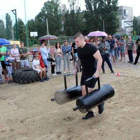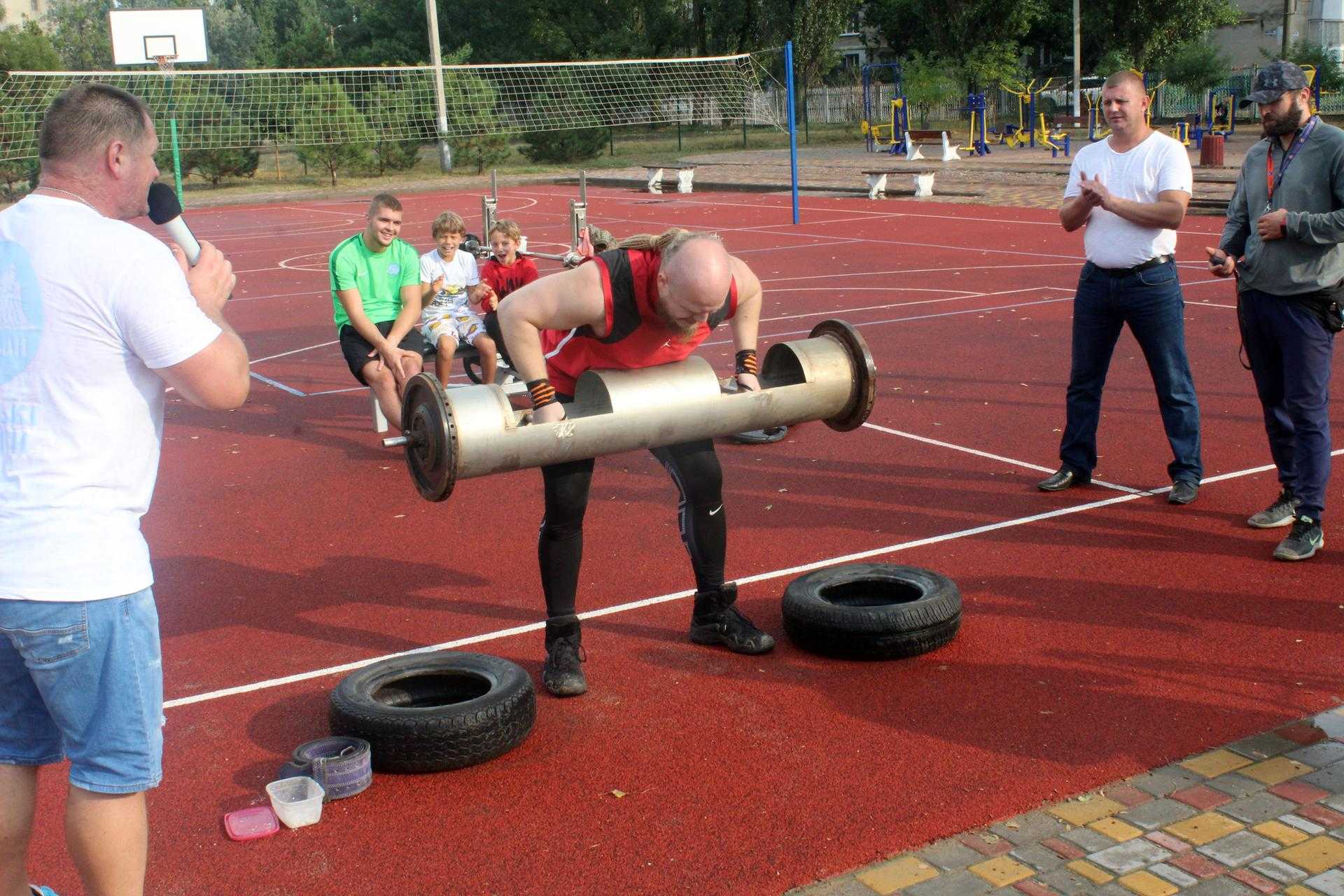 На спортивному майданчику по вул. Сонячній, 4, спортсмени демонстрували свою силу у різних вправах: переносили балони, перекочували величезні покришки, піднімали залізну колоду, тягнули в упряжці автомобіль та піднімали штангу.