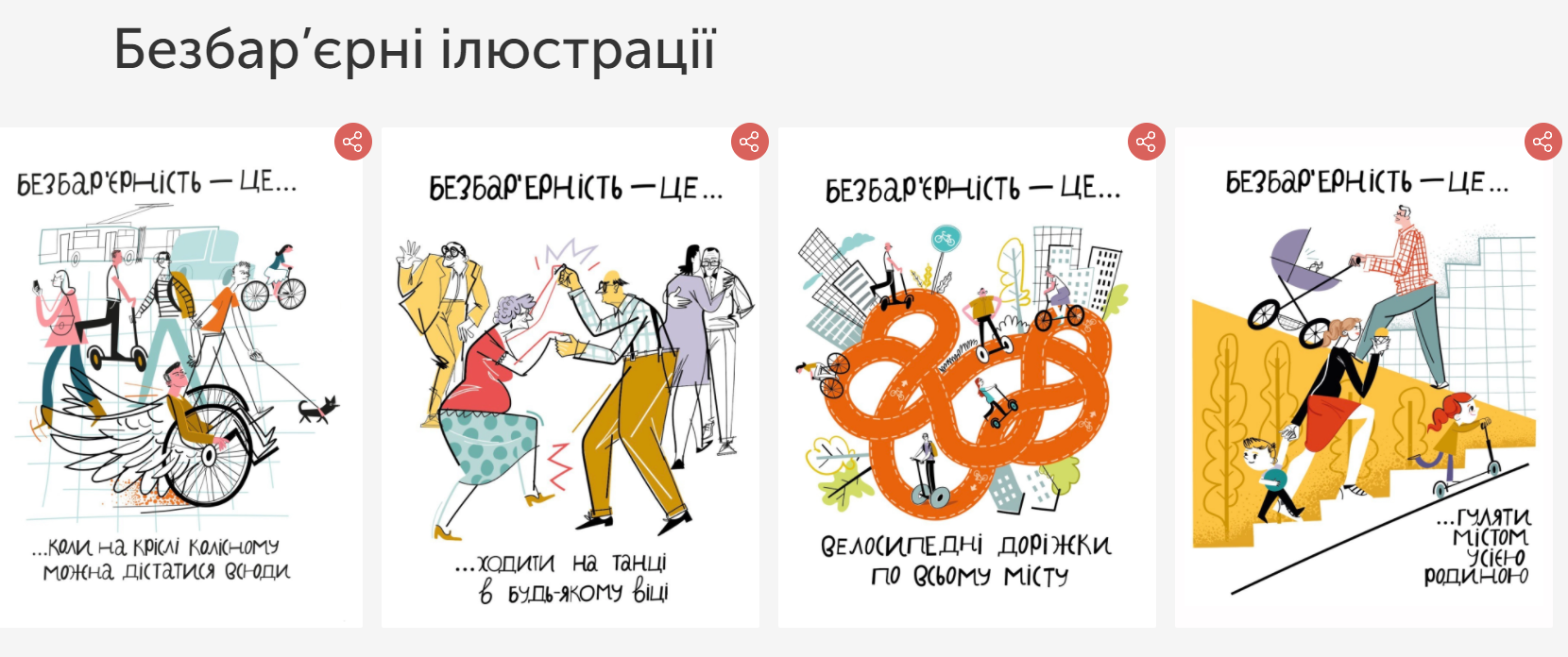 У розділі «Складові безбар’єрності» простою та доступною мовою розкривається поняття безбар’єрності. Що таке, власне, бар’єри, інклюзія, залучення, недискримінація, прийняття, доступність тощо.