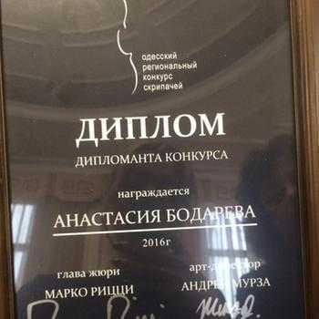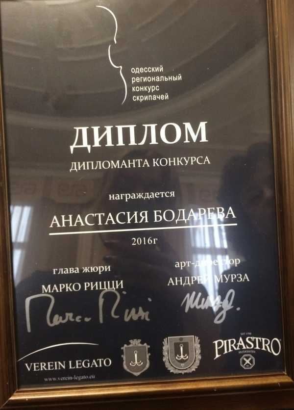 Серед дипломантів – наймолодша учасниця конкурсу Анастасія Бодарева, талановита учениця викладача Ірини Михайліченко Білгород-Дністровської дитячої музичної школи. Настя представила на конкурс 2 музичні твори: «Сурок» Л. Бетховена та «Хоровод» Н. Бакланова (дивитись за посиланням: https://www.youtube.com/watch?v=UdWxxkLLMLc). Дівчинка настільки сподобалася організаторам та членам журі конкурсу, що їй було вручено особистий подарунок – дитячу скрипку роботи німецького майстра початку ХІХ ст.