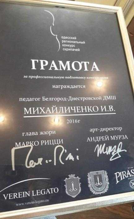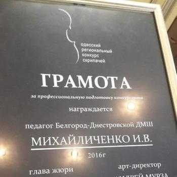 Слід також відзначити, що ІІІ премію отримала випускниця Білгород-Дністровської ДМШ – Тернова Алла, яка зараз навчається в ОССМШІ ім. проф. П. Столярського (м.Одеса). Алла також є ученицею Ірини Міхайліченко, відомої в нашому місті, як керівник зразкового ансамблю скрипалів «Віола».